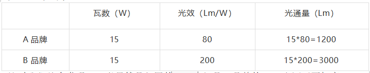 同樣為15W的LED光源。A品牌光源光效為80Lm/W,而B品牌光源光效為200Lm/W,光通量對比為: