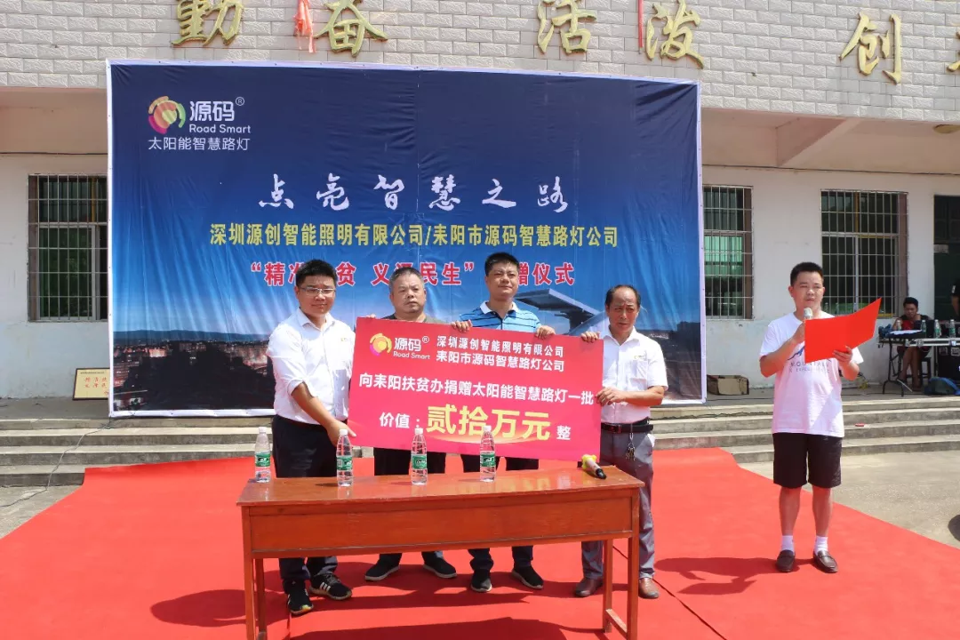 儀式現場,源碼王總和耒陽源碼周總向哲橋鎮紅星村與黎明村無償捐贈一批源碼太陽能智慧路燈,王總表示“源碼將始終肩負責任,在提供好產品的同時,懷著感恩的心,繼續用我們最大的努力為精準扶貧貢獻力量?!?/span>